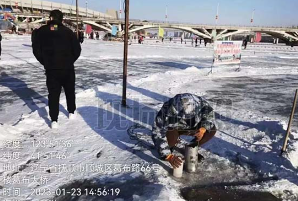 在浑河葛布桥国考断面点位冰层达到50厘米厚,破冰钻又出了故障,只能几人轮换,一镐头一镐头地刨冰,刨了好大一会儿,成效也不明显。为了完成今天的采样任务,王勃就近借来钢钎子开凿。“冰层太厚了,没到水面,再往下打。”“我先搓搓手,快冻僵了。”零下28度的寒冷天气,站在白雪覆盖的河面上,采样人员帽子、睫毛上都结了一层白霜。